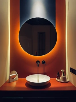 Ein Spiel aus Licht und Schatten: Die warme Aura des Spiegels trifft auf minimalistisches Design und schafft einen Ort der stillen Reflexion.